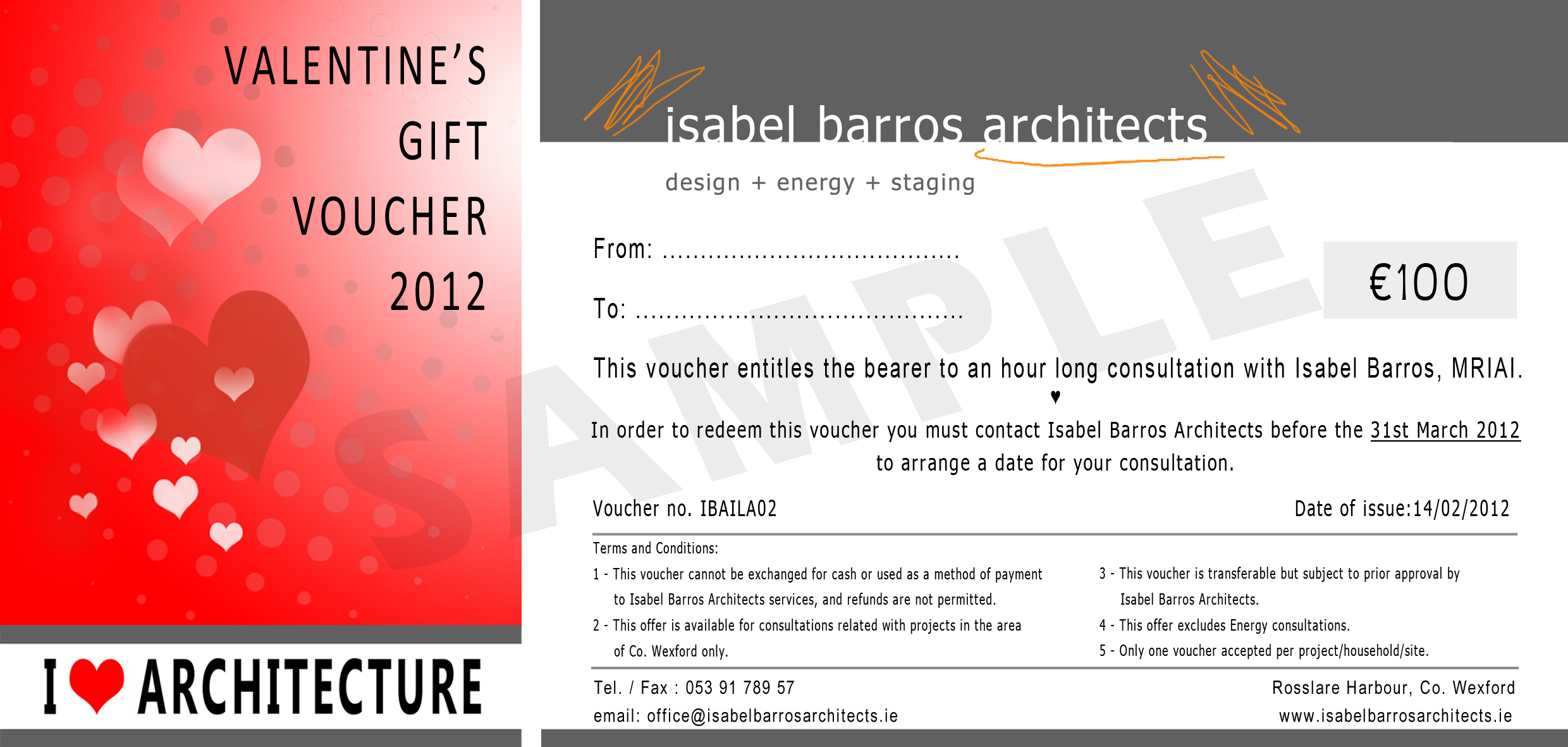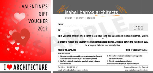 You can obtain your free Valentine’s Gift Voucher for a consultation worth €100 by contacting Isabel Barros Architects office at 053 91 78957 or by sending an email to office@isabelbarrosarchitects.ie. Hurry up, last year the vouchers were gone in less than a week!